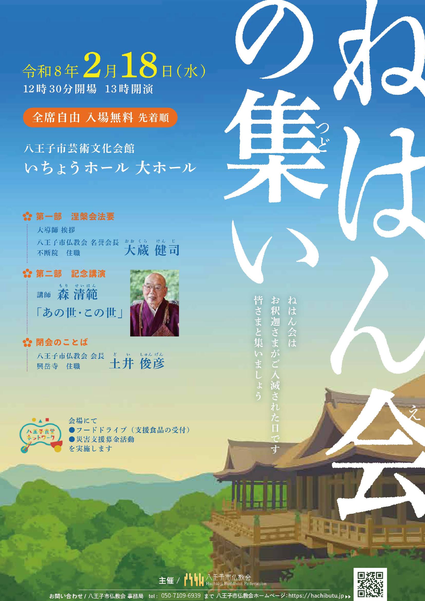 令和8年の八王子市仏教会「ねはん会の集い」を2月18日(水)に八王子市芸術文化会館 いちょうホール 大ホールにて開催いたします。